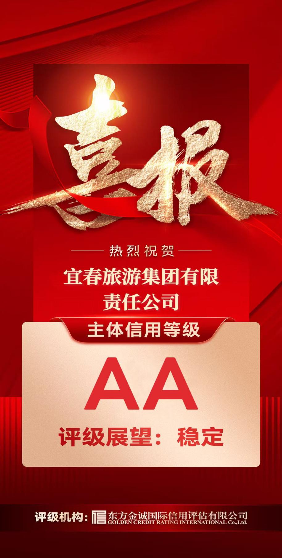 宜春旅游集團有限責(zé)任公司經(jīng)國內(nèi)權(quán)威信用評級機構(gòu)東方金誠國際信用評估有限公司綜合評定,成功獲得“AA”主體信用等級,評級展望為穩(wěn)定。