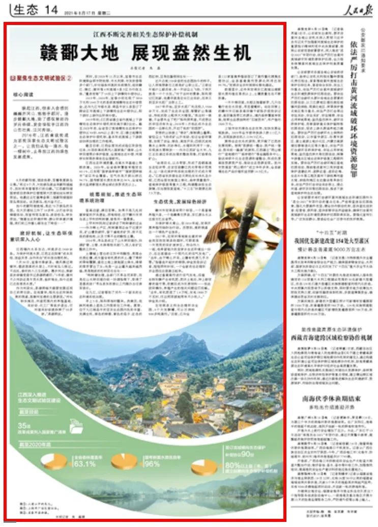 截至目前,江西全面完成試驗區(qū)階段性任務(wù),35項改革成果列入國家推廣清單,山水林田湖草沙保護修復、全流域生態(tài)補償、河湖林長制等改革走在全國前列。